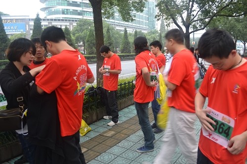 2、朱思好同學前幾天打籃球扭傷了腳跑不了馬拉松了,但他當天還是堅持來到現(xiàn)場為大家加油,很辛苦的做起了后勤工作。