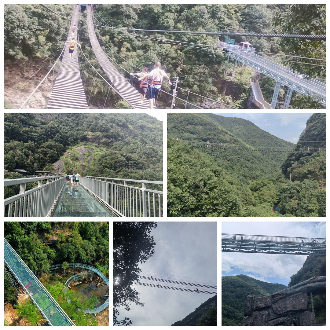 不同于峽谷漂流的怪石嶙峋、水花四濺,玻璃漂流水道要緩和許多,其間還能夠欣賞到蒼翠蔥蒙的山林景色。當(dāng)然,在到達(dá)起點(diǎn)之前,需先經(jīng)過一段玻璃棧道,垂直向下可看到林影密布與涓涓細(xì)流,仿佛在空中漫步,不遠(yuǎn)處兩山之間還有繩索連接著的徽商古道,木板間隔鋪就,只能緩慢跨步前行,著實(shí)稱得上是“練膽”神器。