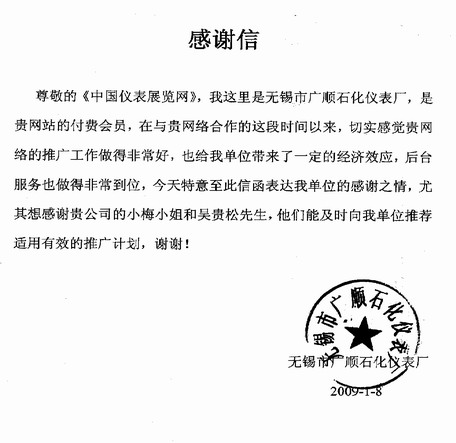 無錫市廣順石化儀表廠在中國(guó)儀表展覽網(wǎng)的服務(wù)下,開展網(wǎng)絡(luò)推廣營(yíng)銷,為企業(yè)產(chǎn)品銷售和渠道拓展起到了切實(shí)的推動(dòng)作用。廣順石化儀表特意傳來感謝信,表達(dá)了對(duì)中國(guó)儀表展覽網(wǎng)和相關(guān)工作人員的贊賞和感謝。