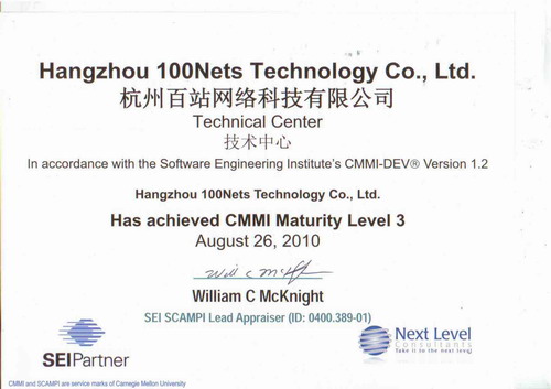 2010年8月26日上午,在杭州百站網(wǎng)絡(luò)科技有限公司會議室舉行的CMMI3級認(rèn)證結(jié)果報(bào)告會上,來自美國的評估師Will鄭重宣布:經(jīng)過嚴(yán)格的現(xiàn)場審核和評估,百站網(wǎng)絡(luò)已達(dá)成CMMI3級目標(biāo),成功通過CMMI3級認(rèn)證。