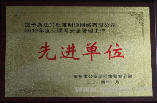1月7日,2013年杭州互聯(lián)網(wǎng)企業(yè)新春會(huì)暨杭州市網(wǎng)絡(luò)協(xié)會(huì)年會(huì)在杭州召開,會(huì)上表彰了2013年在互聯(lián)網(wǎng)安全管理工作中的先進(jìn)單位和先進(jìn)個(gè)人。會(huì)議上,杭州市公安局網(wǎng)絡(luò)警察分局對(duì)在2013年度中成績突出的20家單位予以通報(bào)表彰并進(jìn)行授牌,浙江興旺寶明通網(wǎng)絡(luò)有限公司榮獲“2013年度互聯(lián)網(wǎng)安全管理工作先進(jìn)單位”稱號(hào)。