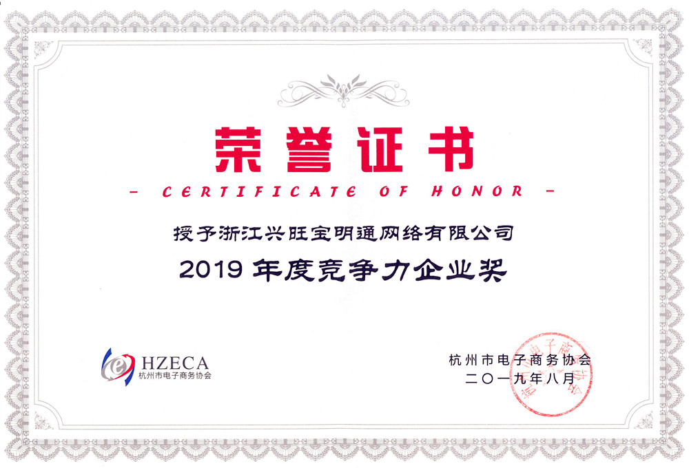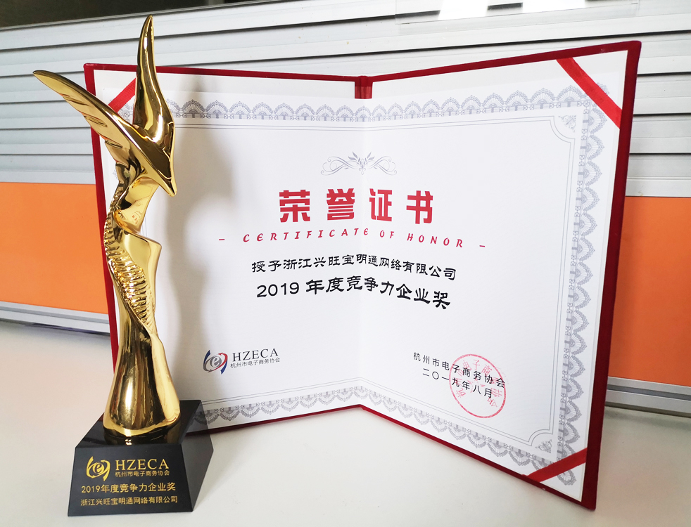 浙江興旺寶明通網(wǎng)絡有限公司榮獲“2019年度競爭力企業(yè)獎”
