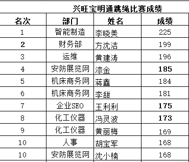 第一名是來自智能制造網的李曉美,一分鐘跳繩成績高達225次,小編看到這兒已經驚呆了,要知道我國一分鐘跳繩最高記錄就是286次,果然天外有天,高手在民間啊。值得一提的是,這位小伙伴也是公司全體參賽人員中唯一突破200個大關的選手,果然就像主持人介紹的那樣,別看人家看著個子小,爆發(fā)起來是一鳴驚人,厲害!