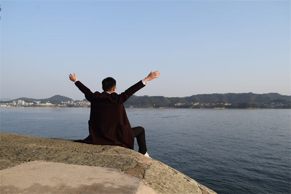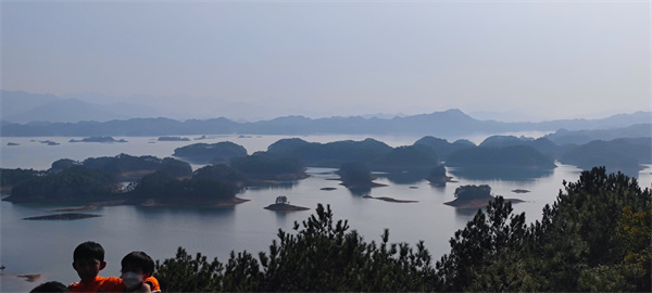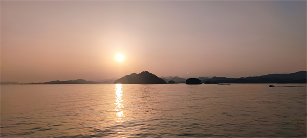踏上游船甲板,清風(fēng)習(xí)習(xí),甚是舒暢。遠(yuǎn)看,綽綽約約的青山一嶂疊著一嶂,好似水墨潑就;近觀,零星島嶼礁石灑落在清靈的湖水之上,仿若空懸。乘船而行,景致開闊而不單調(diào)、豐富而不繁雜,不禁感嘆一句:真乃巧奪天工。