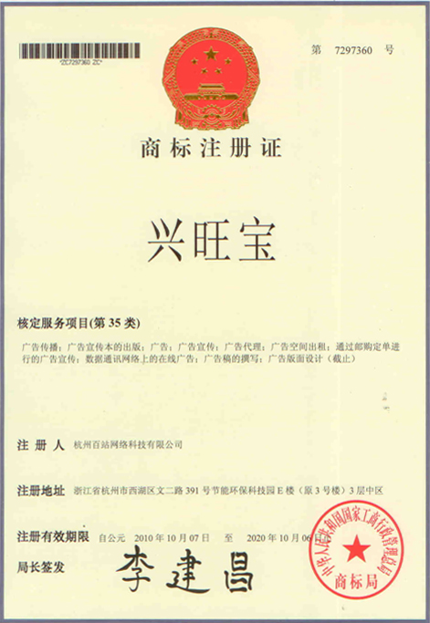 明通子公司百站網絡的注冊商標為“興旺寶”,由旗下24大行業(yè)網站共同使用,核定服務項目為第35類,具體包括廣告?zhèn)鞑?;廣告宣傳本的出版;廣告;廣告宣傳;廣告代理;廣告空間出租;通過郵購訂單進行的廣告宣傳;數據通訊網絡上的在線廣告;廣告稿的撰寫;廣告版面設計等服務項目。