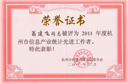 2011年12月23日,杭州市經(jīng)濟(jì)系信息化委員會(huì)辦公室發(fā)文,表彰了全市50位“2011年杭州市信息產(chǎn)業(yè)統(tǒng)計(jì)先進(jìn)工作者”,浙江興旺寶明通網(wǎng)絡(luò)有限公司財(cái)務(wù)主管翁建飛獲得“先進(jìn)工作者”殊榮。